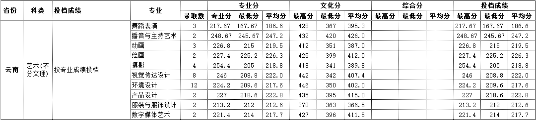 2020年云南 艺术类录取情况