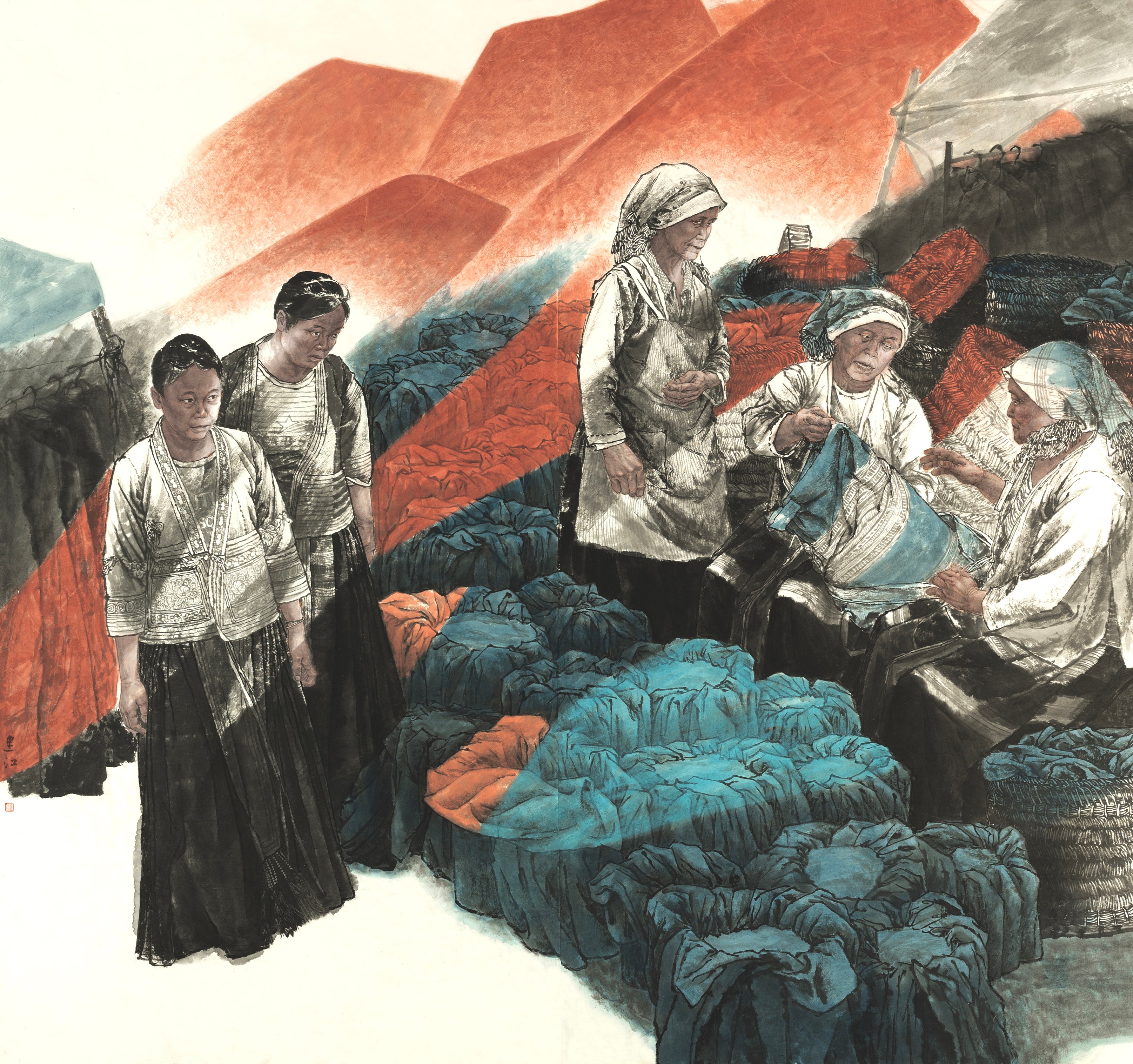 本作品以广西隆林德峨偏苗妇女赶圩场景为题材,作品以“劳动尊严”与“文化坚守”为双重主题,借队列式四位偏苗妇女形象暗喻文化传承,借助晨雾与朝晖的光影设计,将日常劳作升华为具有仪式感的文化隐喻。艺术表现上,创新采用未提炼靛青泥与矿物颜料混合的技法,探索传统染料的当代应用,营造斑驳厚重的岩彩肌理与历史纵深感,通过“在地性”材质创新与符号转译,以及光影的运用,为中国人物画注入现代语言。