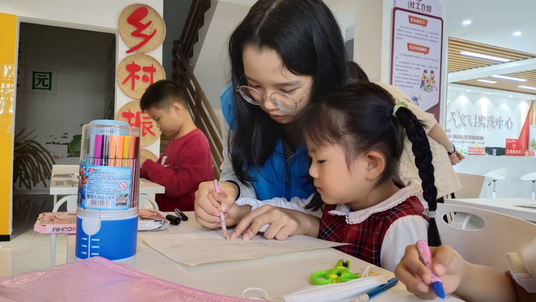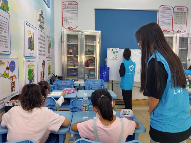 在课堂中,主教和助教都会密切关注孩子们的行为,为让孩子们有一个好的课堂体验,支教学生会积极帮助有困难的孩子完成自己的作品。