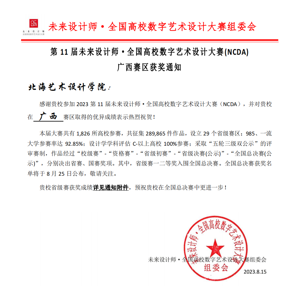 我院师生在2023第11届未来设计师·全国高校数字艺术设计大赛(NCDA)广西赛区取得优异成绩!共荣获广西区赛一等奖17项、二等奖20项、三等奖28项,学校荣获“省级优秀组织单位”奖。
