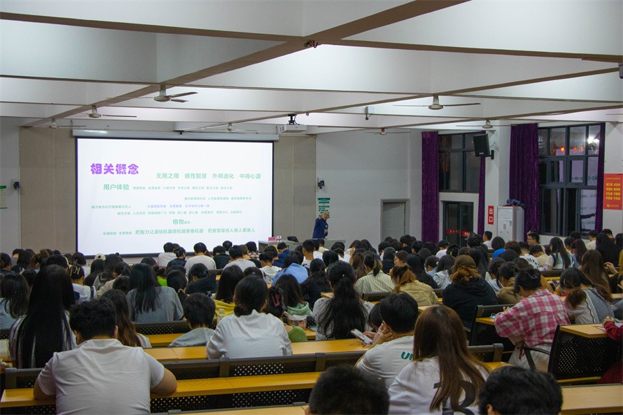 王正明教授依次从无形无用、六感赋能和应用场景三个方面展开讲座内容。他引用多个生活实例,带领现场师生深入探讨当前设计的发展趋势,并解析了其中的原因。他指出:“在时代快速发展之下,人工智能的发展与设计领域密切相关。如何平衡人与机器人之间的关系,实现优势互补和协同共处,是我们教师、学生和设计师迫切需要思考的问题。”