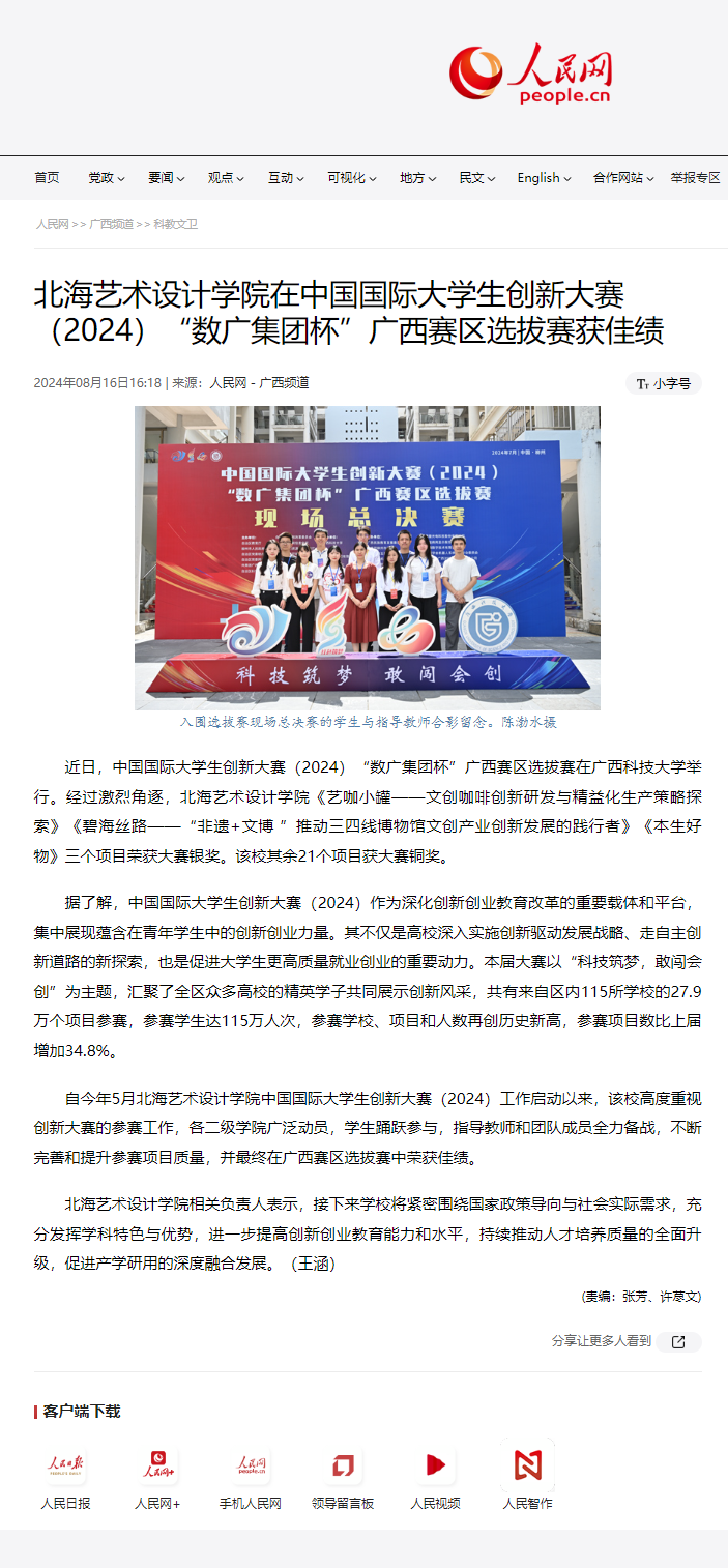 人民网:北海艺术设计学院在中国国际大学生创新大赛(2024)“数广集团杯”广西赛区选拔赛获佳绩