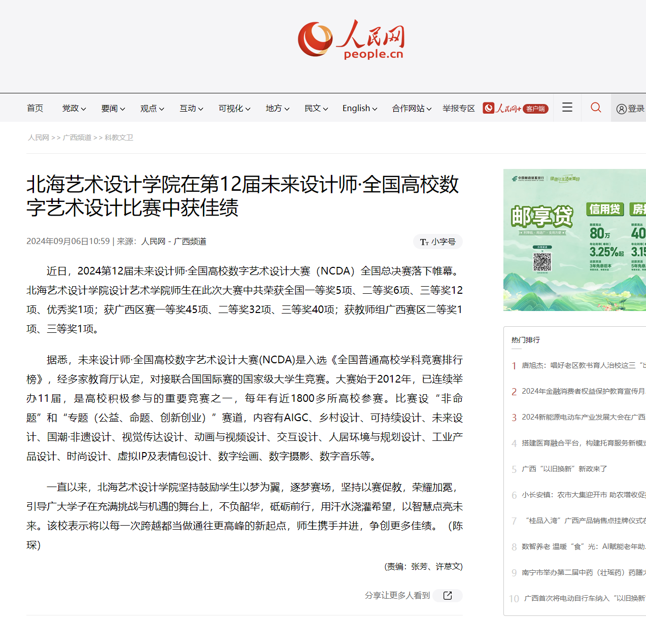 人民网:北海艺术设计学院在中国国际大学生创新大赛(2024)“数广集团杯”广西赛区选拔赛获佳绩
