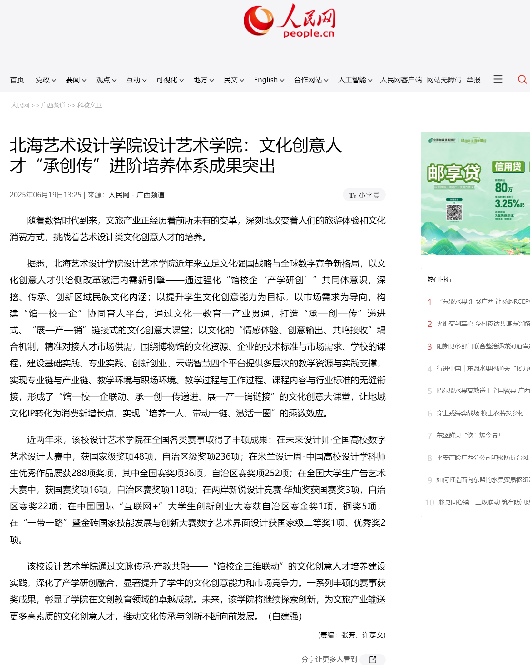 人民网:北海艺术设计学院设计艺术学院文化创意人才“承创传”进阶培养体系成果突出