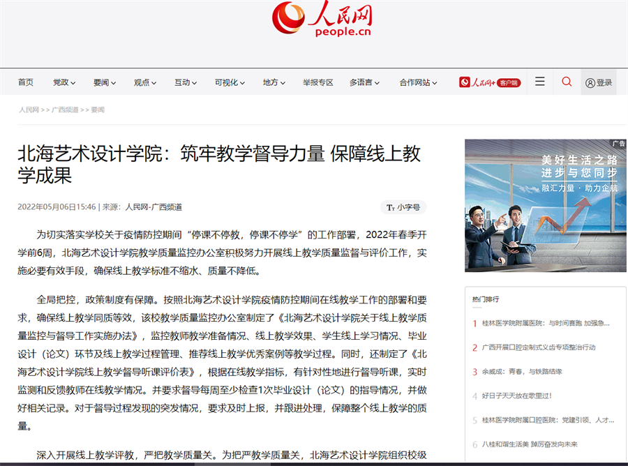 5月6日,人民网以《北海艺术设计学院:筑牢教学督导力量 保障线上教学成果》为题,报道我校教学质量监控办公室开展的线上教学质量监督与评价工作,学校上下协同,形成了线上教学质量保障闭环,筑牢教学督导力量,基本实现线上线下教学工作“同质等效”,保障线上教学成果。
