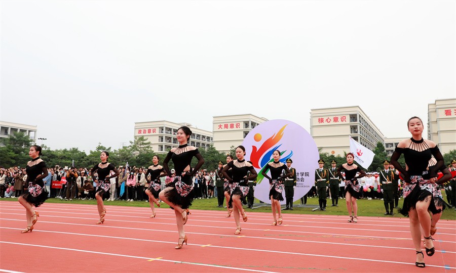 精彩绝伦的表演节目,为开幕式增添光彩,引爆气氛高潮。2022年十佳歌手带来歌曲《闪亮启航》,悠扬歌声、欢快旋律交相辉映。由获得2022年全国啦啦操锦标赛(普通高校组)第一名的同学带领表演的啦啦操,大大鼓舞了士气。人文教育学院舞蹈专业表演的拉丁舞,自信优雅的姿态展示无限魅力。由刘琛钊老师领衔舞蹈专业伴舞的大型歌伴舞节目《向往》传递磅礴力量。