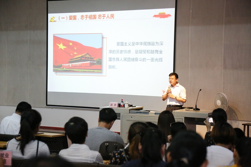 钦州学院党委书记赵君教授以“学习习近平总书记重要讲话精神,争做担当民族复兴大任的时代接班人”为题,紧密联系生活实际,深入讲解习总书记在北京大学师生座谈会讲话中对广大青年提出“爱国、励志、求真、力行”四方面要求。赵君书记指出广大青年学生要爱国,忠于祖国,忠于人民;要励志,立鸿鹄志,做奋斗者;要求真,求真学问,练真本领;要力行,知行合一,做实干家。同时,赵君书记强调要不断强化责任担当,争做爱国励志求真力行新青年,并提出要求做到将个人梦和中国梦有机结合,做新时代追梦人和圆梦人;增强责任感,做到“四个负责”;坚持“四个自信”,勇担时代大任。