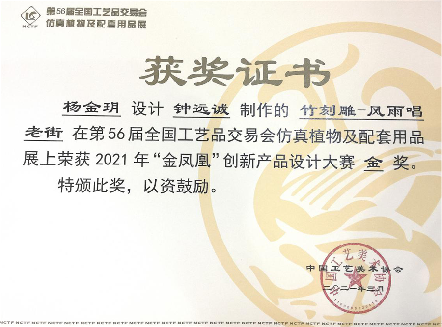 日前,第56届全国工艺品交易会由中国工艺美术协会主办,各省、自治区、直辖市工艺美术协会协办,于3月5日-8日在福建省福州海峡国际会展中心举办。我校环境艺术设计学院杨金玥老师和设计学院产品设计钟远诚老师制作的作品“竹刻雕——风雨唱老街”荣获2021年“金凤凰”创新产品设计大赛金奖。