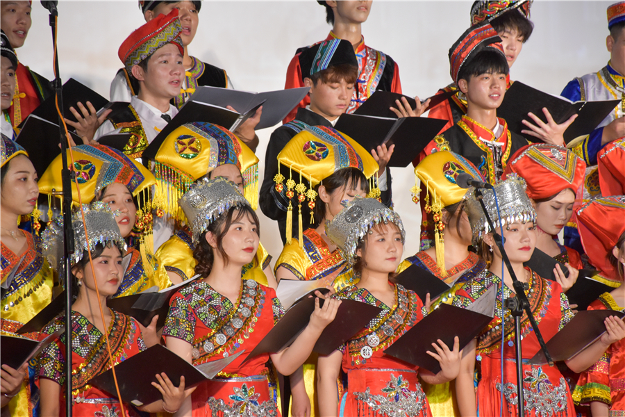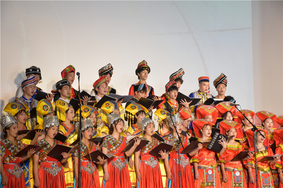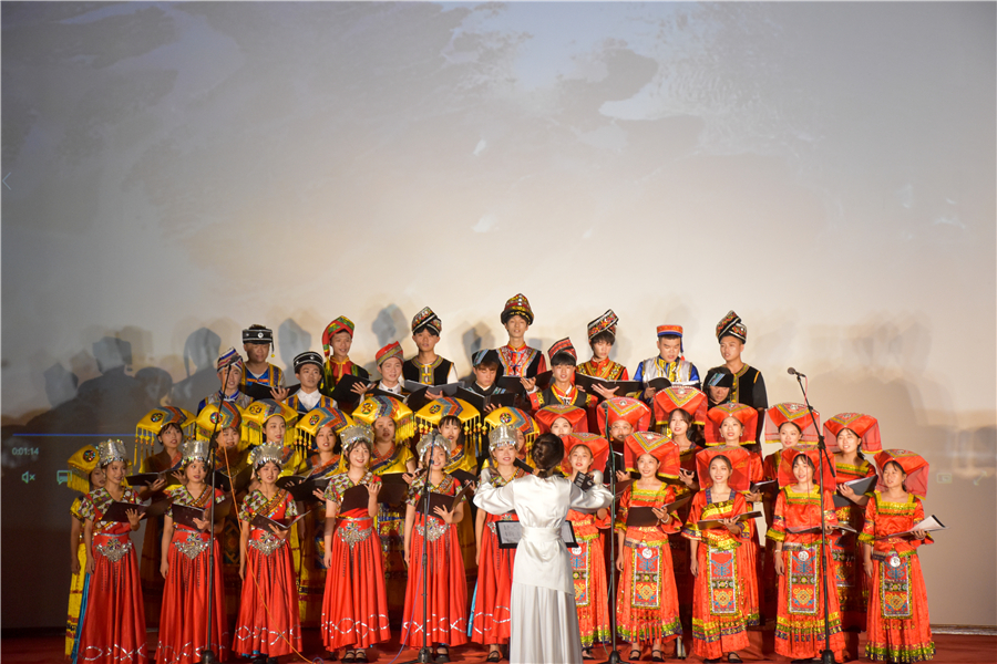 饶承硕、高菲等同学表演女声小组唱苗族歌曲《簸萁上的麻雀》,让同学们感受到:一朵花是渺小的,但聚成一树,一树开花就成了春天;一个人是渺小的,但千万个你我在一起,便成一个民族。