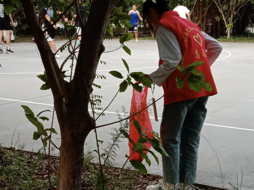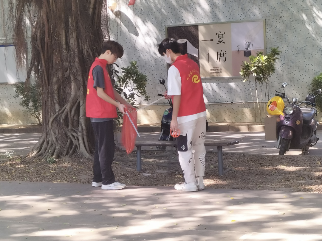 参与活动的志愿者被分为两小组,由组长带队分别前往西区十一栋旁、西区篮球场和操场周边以及东区操场、东区十一栋、东区篮球场等地进行垃圾清理。