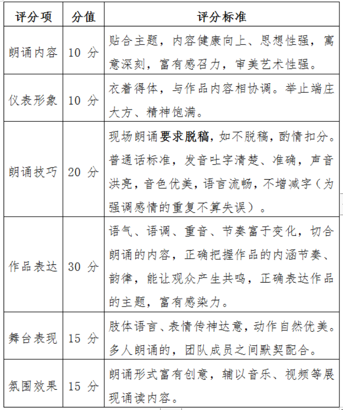 第五届广西高校大学生“悦读向未来 强国我担当”朗诵大赛评分细则