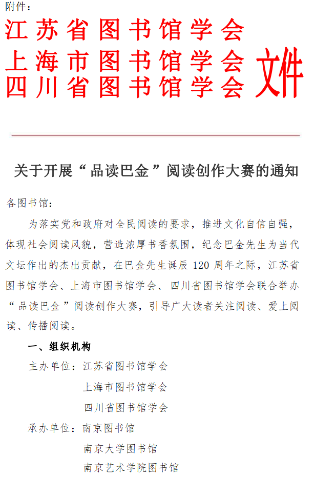 为推进文化自信自强,纪念巴金先生为当代文坛作出的杰出贡献,在巴金先生诞辰120周年之际,江苏省图书馆学会、上海市图书馆学会、四川省图书馆学会联合举办“品读巴金”阅读创作大赛,引导广大读者关注阅读、爱上阅读、传播阅读。