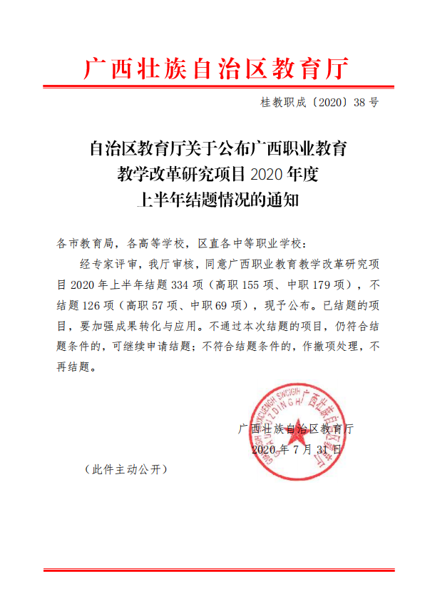 自治区教育厅关于公布广西高等教育本科教学改革研究项目2020年度下半年结题情况的通知