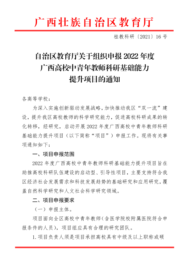 自治区教育厅关于组织申报2022年度广西高校中青年教师科研基础能力提升项目的通知
