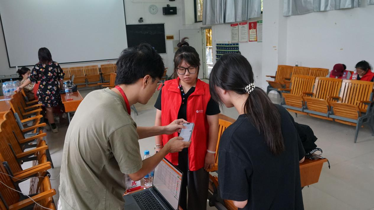 (志愿者在学校接待新生)