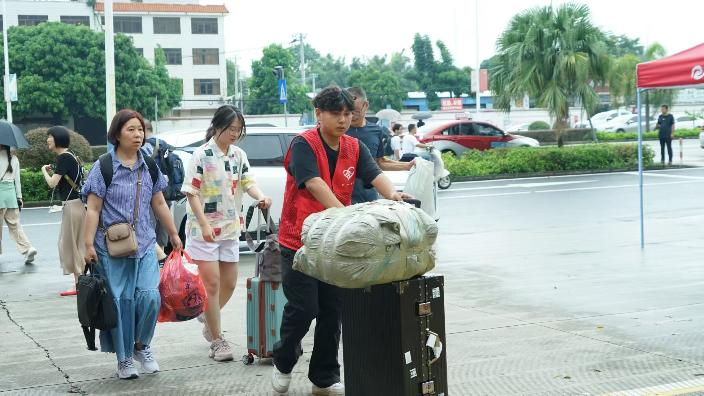 面带微笑的迎新志愿者已经忙碌起来。