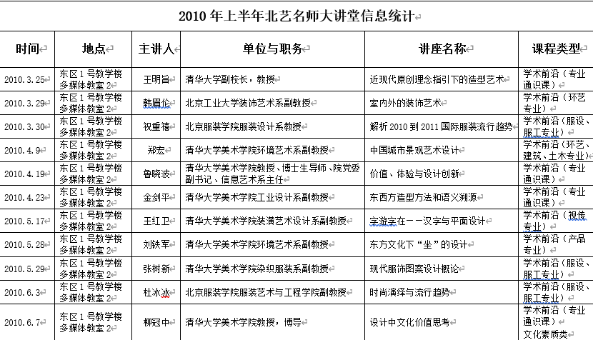 2010年上半年北艺名师大讲堂信息统计