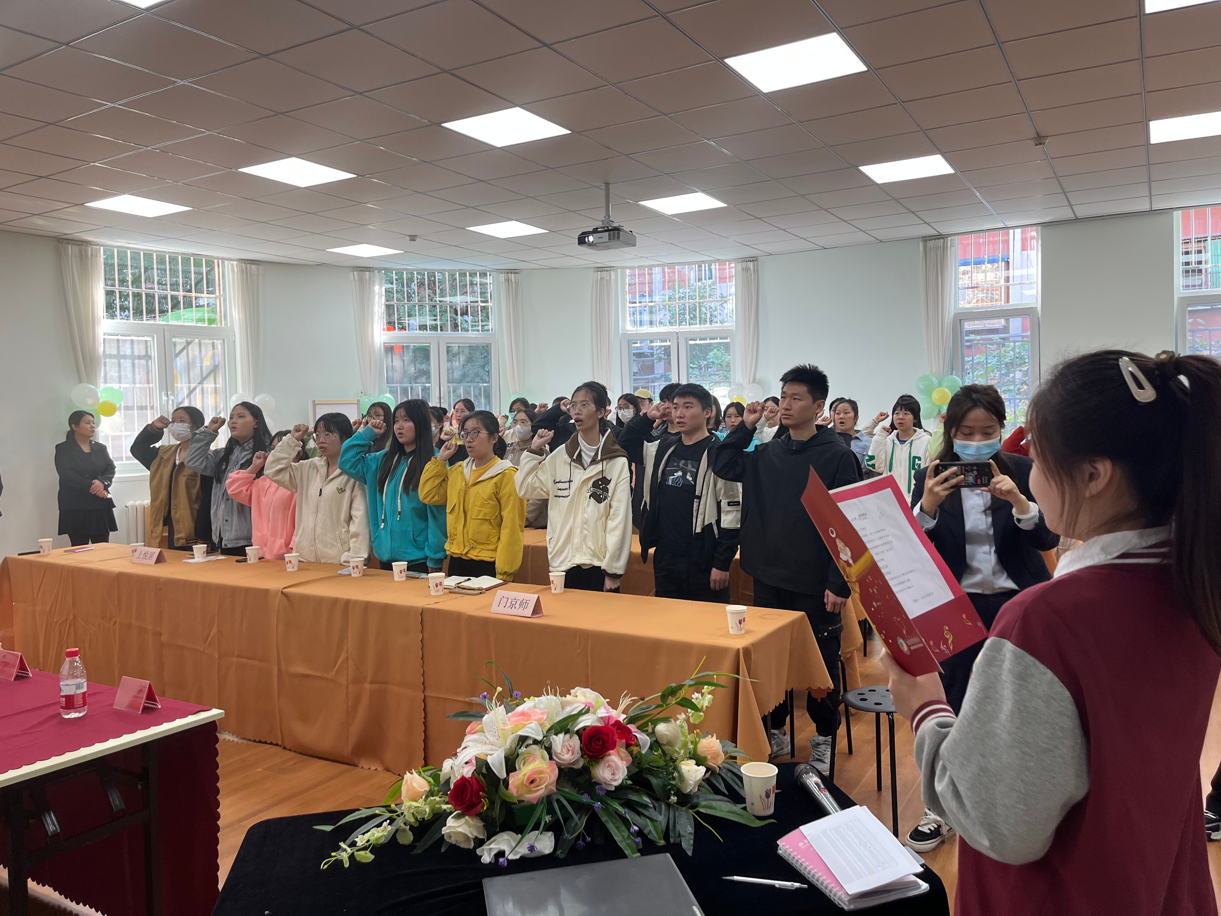 会议最后由京师德培教育集团朝阳区幸福天使幼儿园教师代表、人文教育学院学前教育专业2022届毕业生孙灿与2020级学前教育专业学生一同宣读入职誓词。