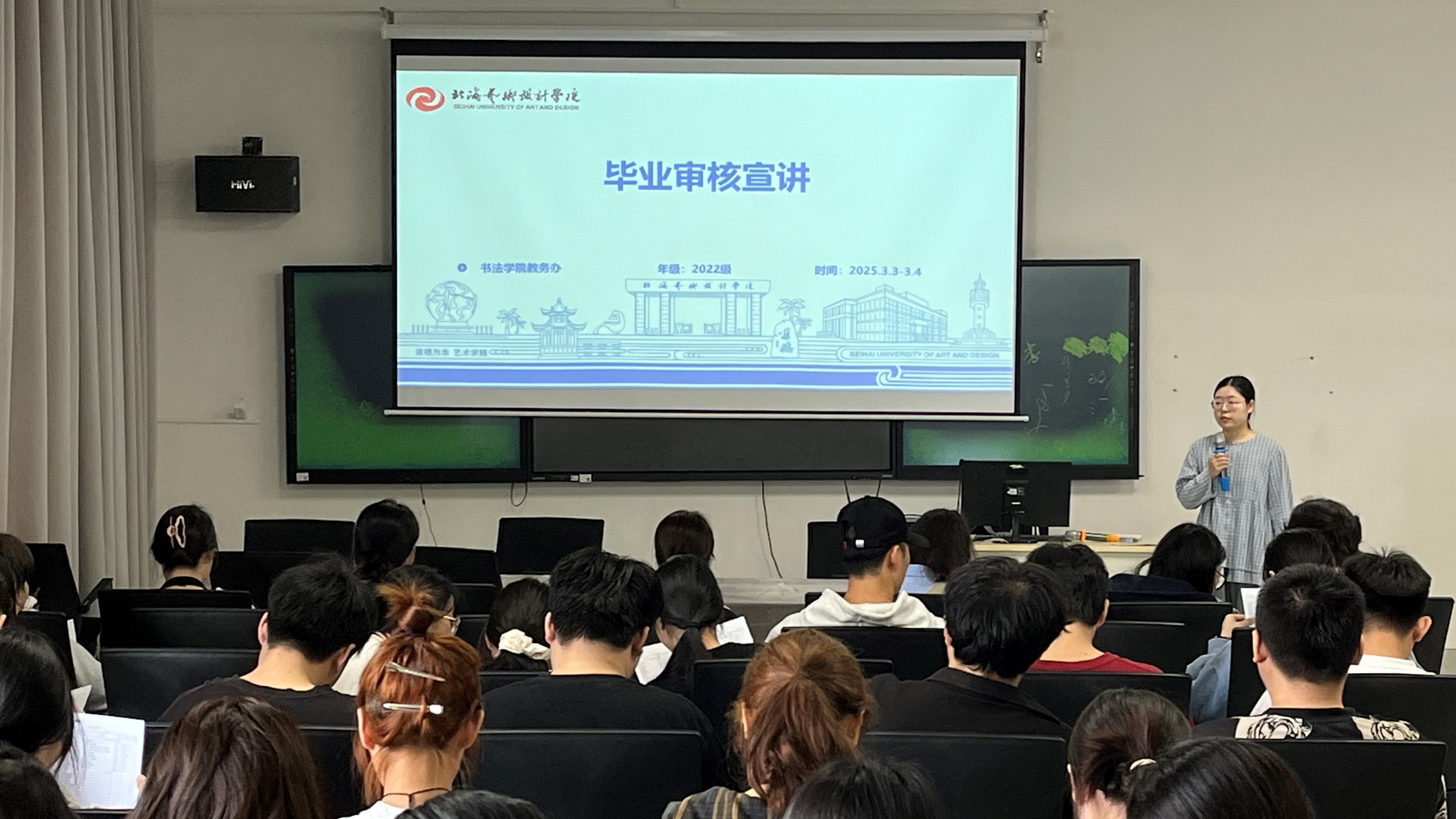 2025年3月3、4日,书法学院教务办于书法学教研室举办针对2022级学生的毕业审核宣讲会。此次活动由书法学院教务办主任熊东老师主持,教务办张菁曼老师、宋燕老师协助宣讲会的顺利举办。