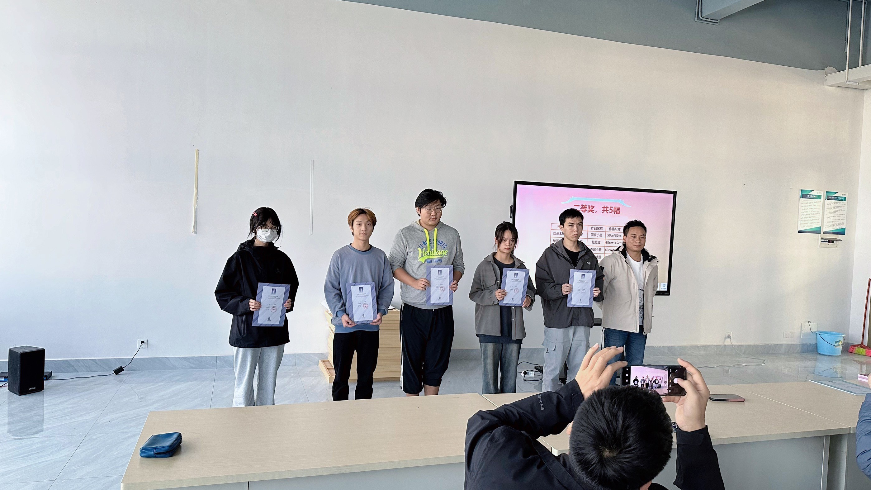 20231227日下午,学院举办了获奖作品的颁奖活动。其中一等奖由美术学院肖玺院长颁发,二等奖由教研室主任刘勇生老师颁发,三等奖由美术学教研室主任陈建江老师和实验室主任袁志伟老师颁发。一等、二等、三等奖项设置了相应的奖励金,意在激发学生对自身专业认同感和良性竞争意识,进而培养学生的自主学习和创作意识。