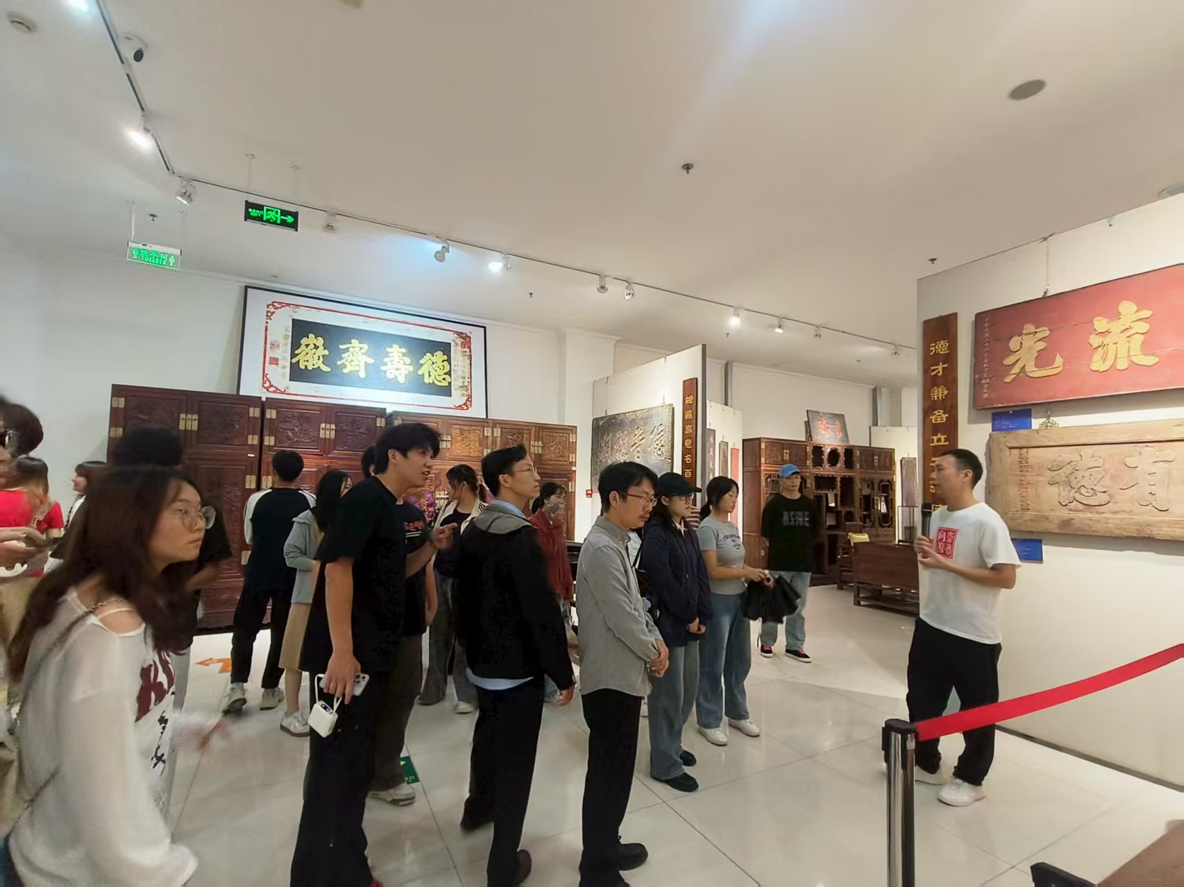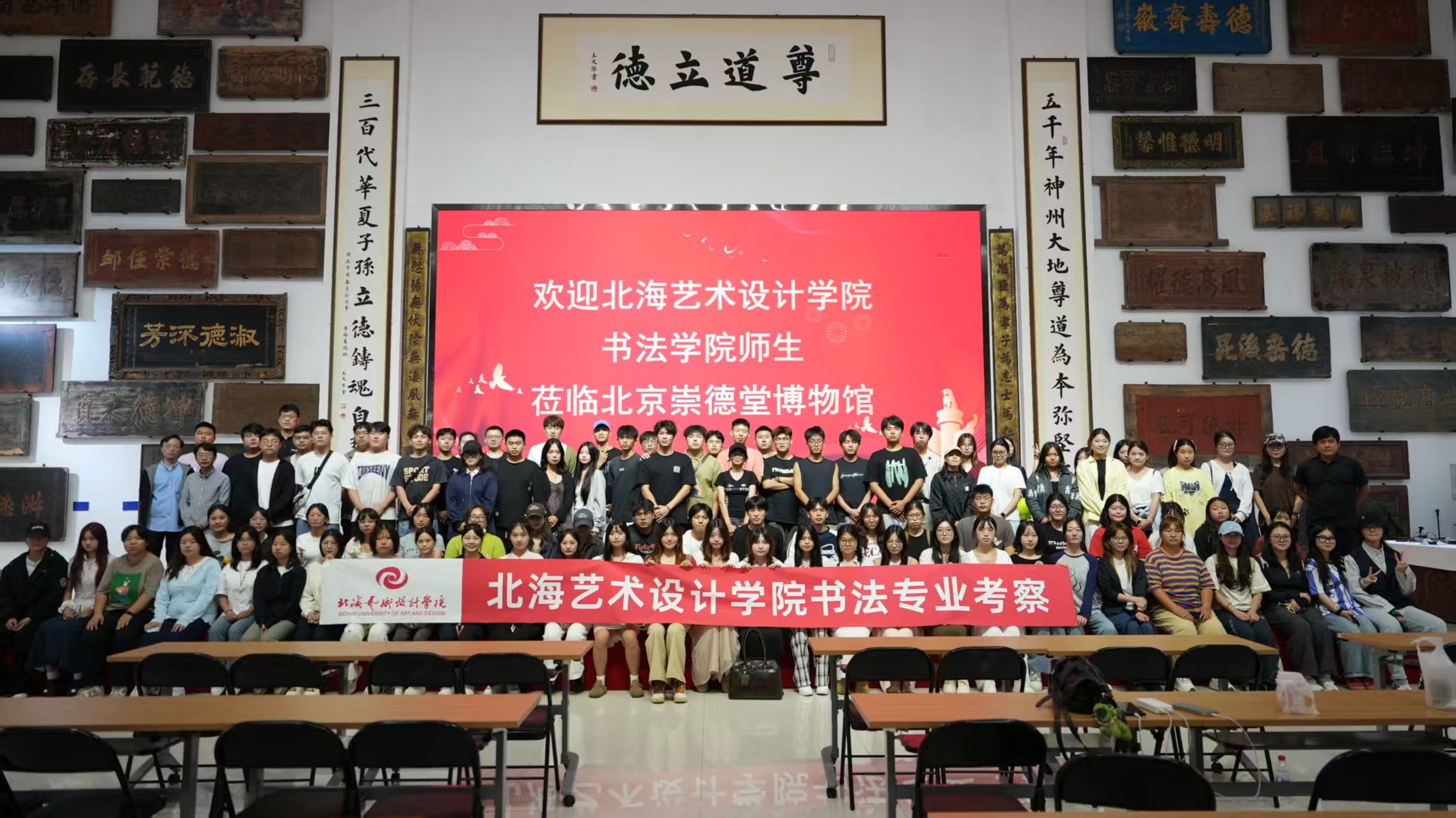 8月29日前往雍和宫、孔庙、国子监与北京崇德堂博物馆,聚焦“古建筑中的书法文化”与“‘德’文化的书法表达”。上午在考察孔庙和国子监时,学生们重点考察了“进士题名碑”“十三经刻石”等文物。下午,师生们前往北京崇德堂博物馆。这座以“德”文化为主题的博物馆,收藏了历代与“德”相关的匾额、碑刻、书画作品近千件,是解读中国“德文化”与书法艺术关系的重要场所。参观结束后,学生们纷纷表示,此次崇德堂之行让自己对“书法与品德”的关系有了全新认识。