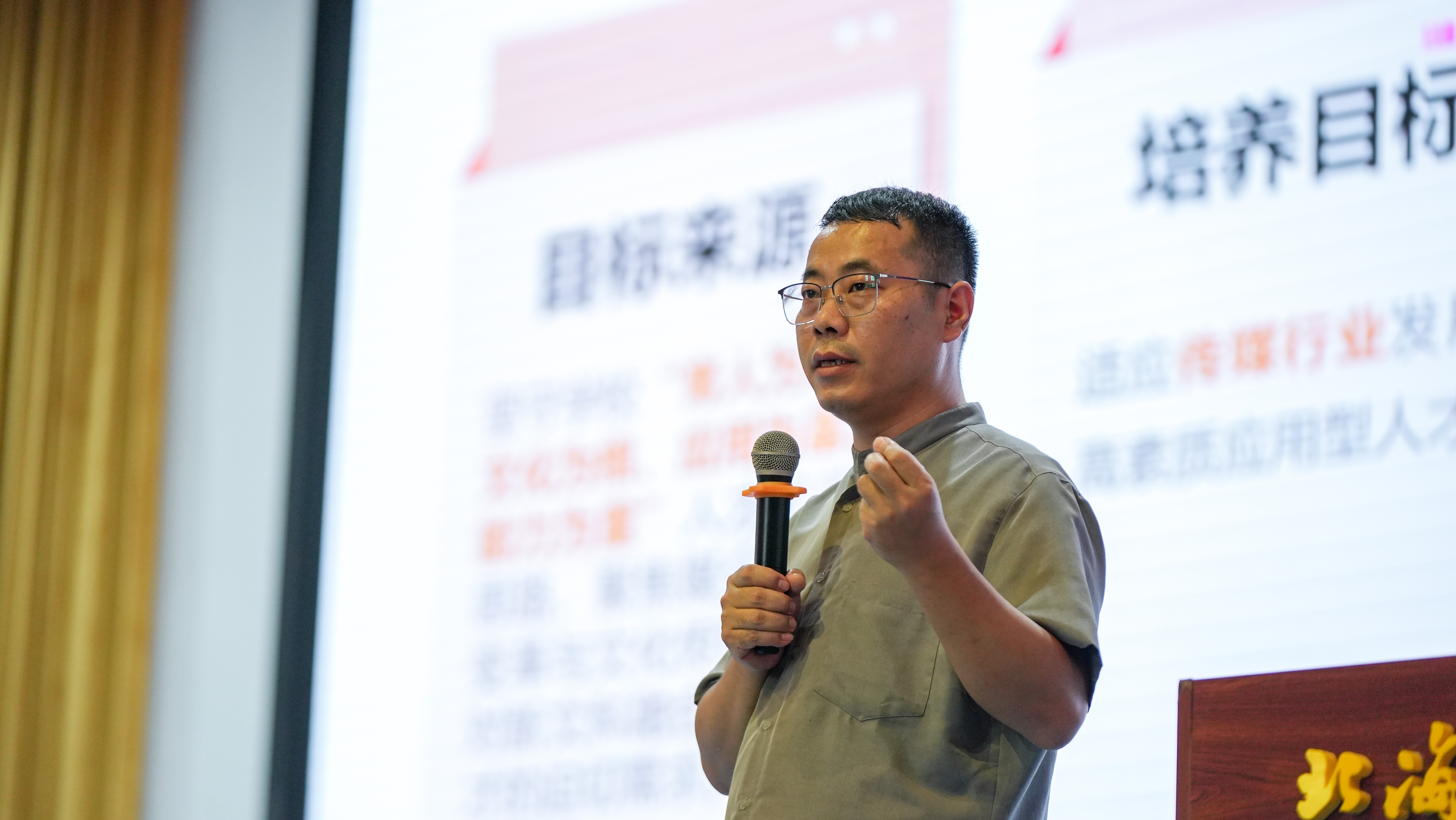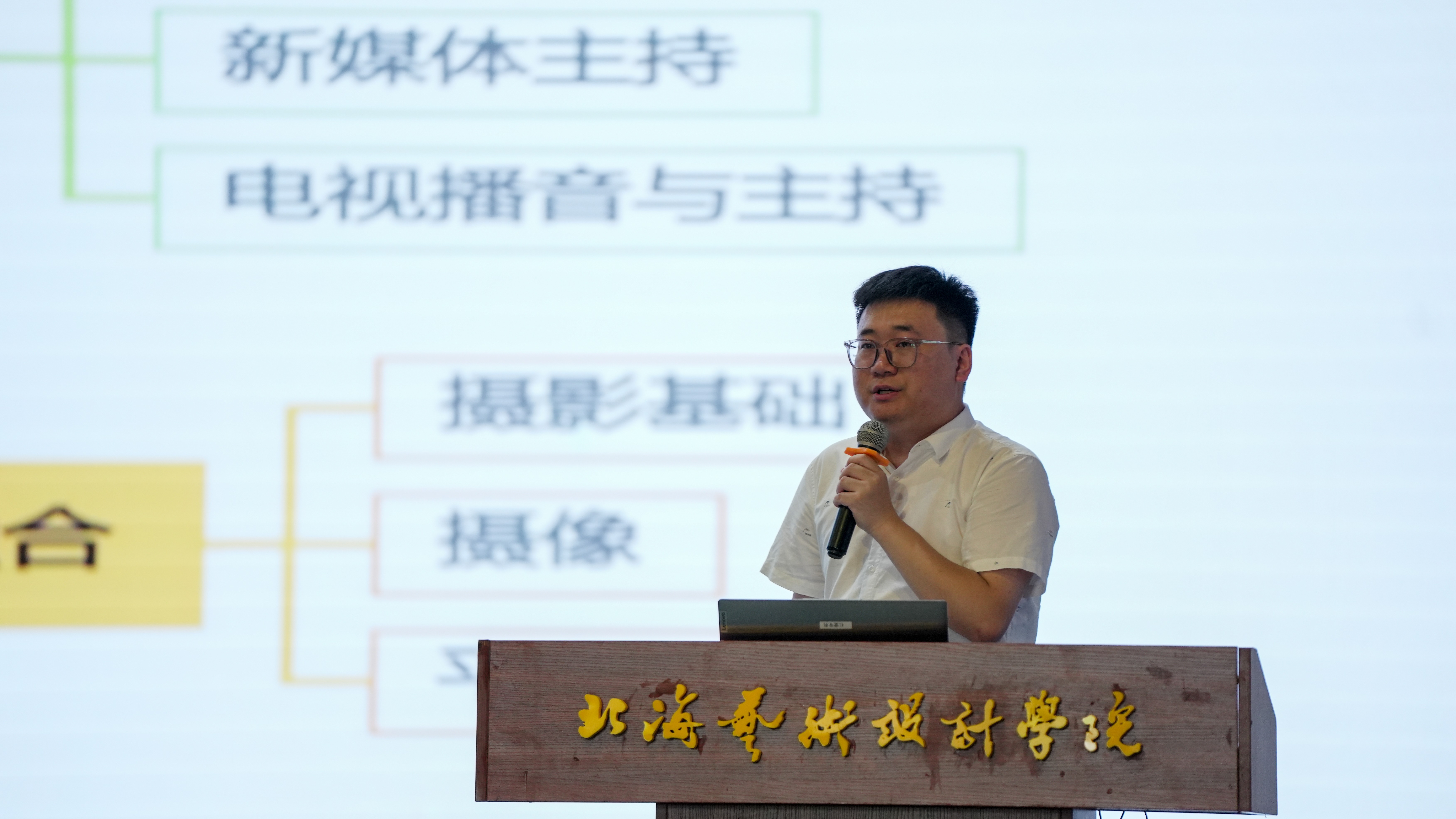 播音与主持艺术教研室主任熊彪全面阐述了播音与主持艺术专业的专业特色与成长路径。播音与主持艺术专业以培育具备“采写编摄评说播”综合能力的高素质应用型人才为核心目标,课程体系遵循“基础—技能—实践—跨专业融合”递进逻辑,同步融入课程思政与校企合作特色。熊彪主任鼓励新生们充分利用“北海 + 北京”双城资源,深耕专业实践;并激励大家在播音道路上持续前行,以扎实硬实力成长为传媒行业的优秀从业者。