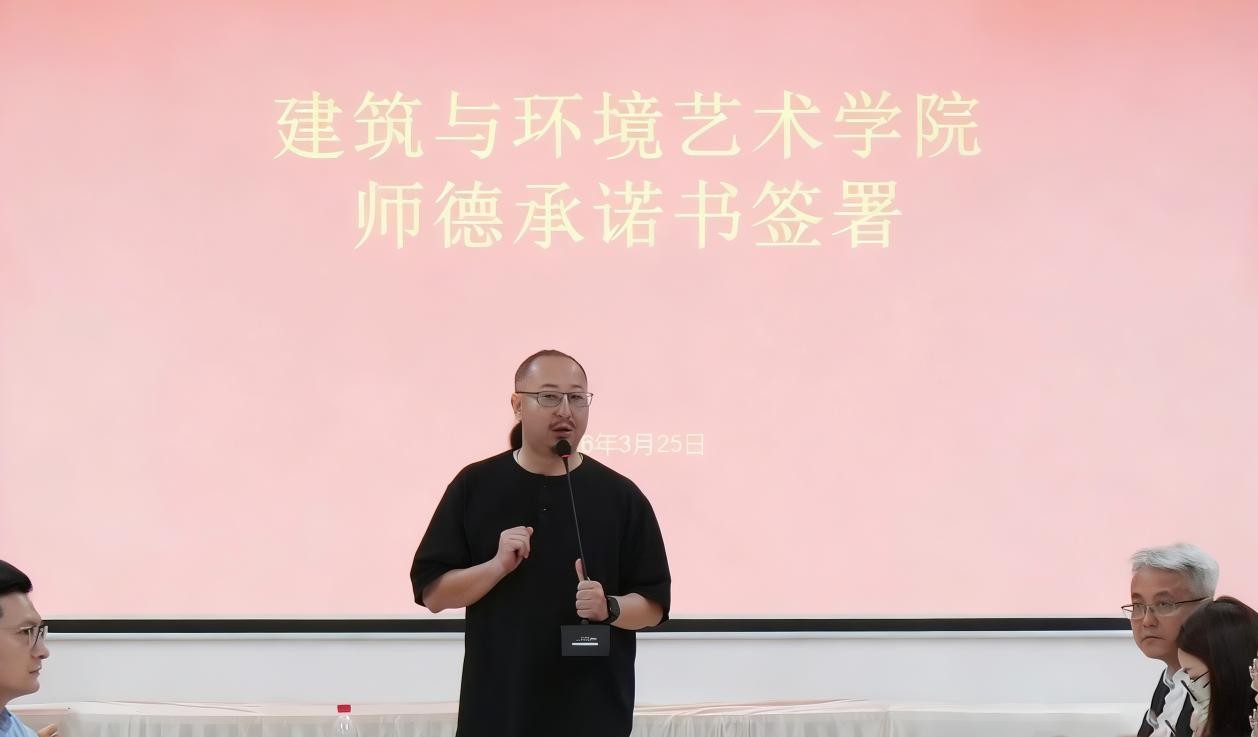 教育大计,教师为本;教师素养,师德为先。为进一步强化教师队伍的师德师风建设,规范教师职业行为,2026年3月25日上午8:30,建筑与环境艺术学院在公德楼207举行了师德师风承诺书签订仪式。大会由学院院长张春东主持,全体教职工参会。