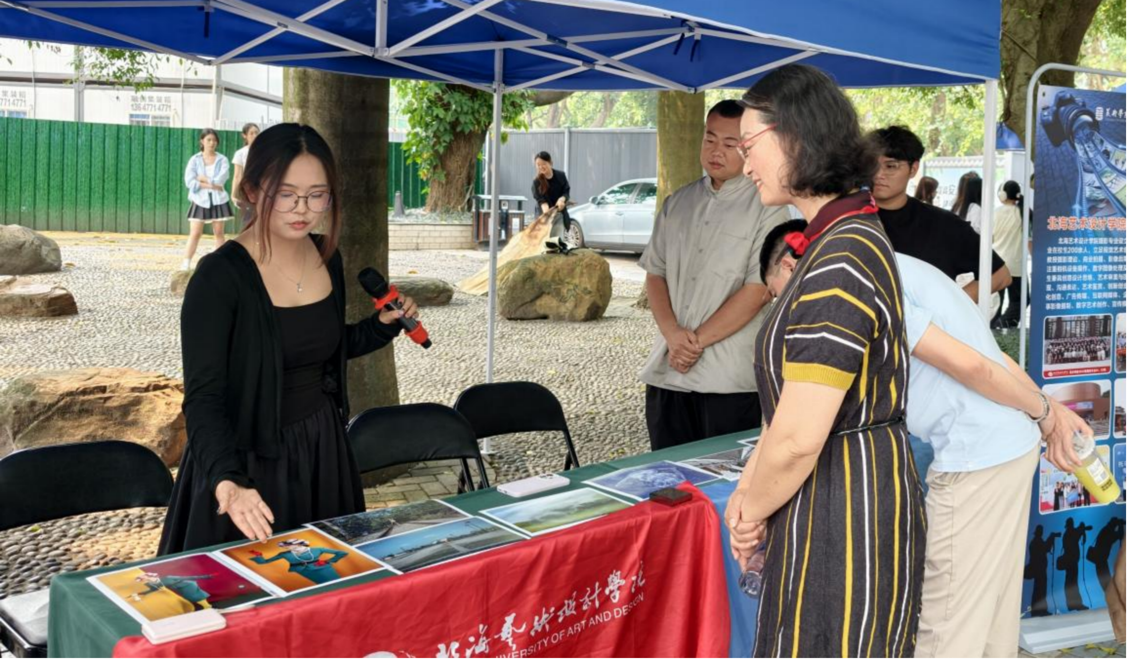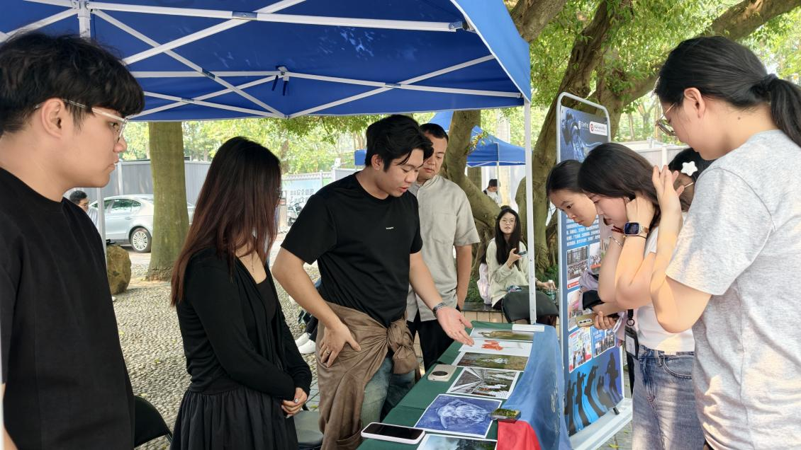 期间,广西摄影家协会主席黄平前来我校展位进行交流,作为资深摄影领域从业者,她仔细观赏我校师生参展作品,与我校师生亲切交谈,结合自身策展与创作经验,对我校作品的创意水准和专业素养给予高度评价