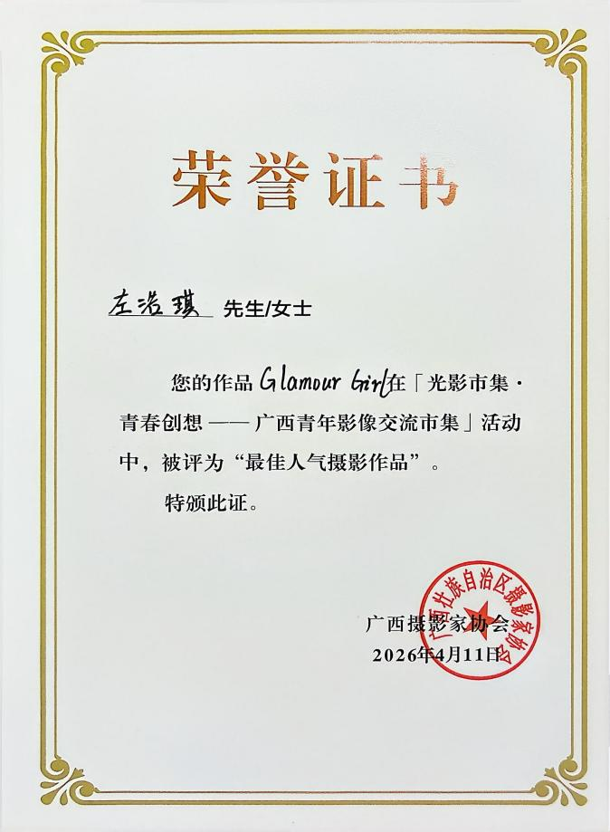 为搭建摄影专业师生交流学习平台,提升学生实践能力与艺术视野,2026年4月11日14:00—18:00,美术学院副书记鲁明阳带领摄影教研室主任李伟民3位摄影专业优秀学生,前往南宁书画院参加第三届广西影像作品展暨广西青年摄影师作品联展(南宁巡展)。摄影专业师生携10幅优质摄影作品参展,其中推荐参评学生左浩琪的一组作品凭借鲜明的创意与扎实的功底,荣获现场最佳人气奖。