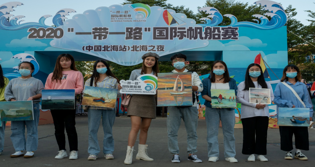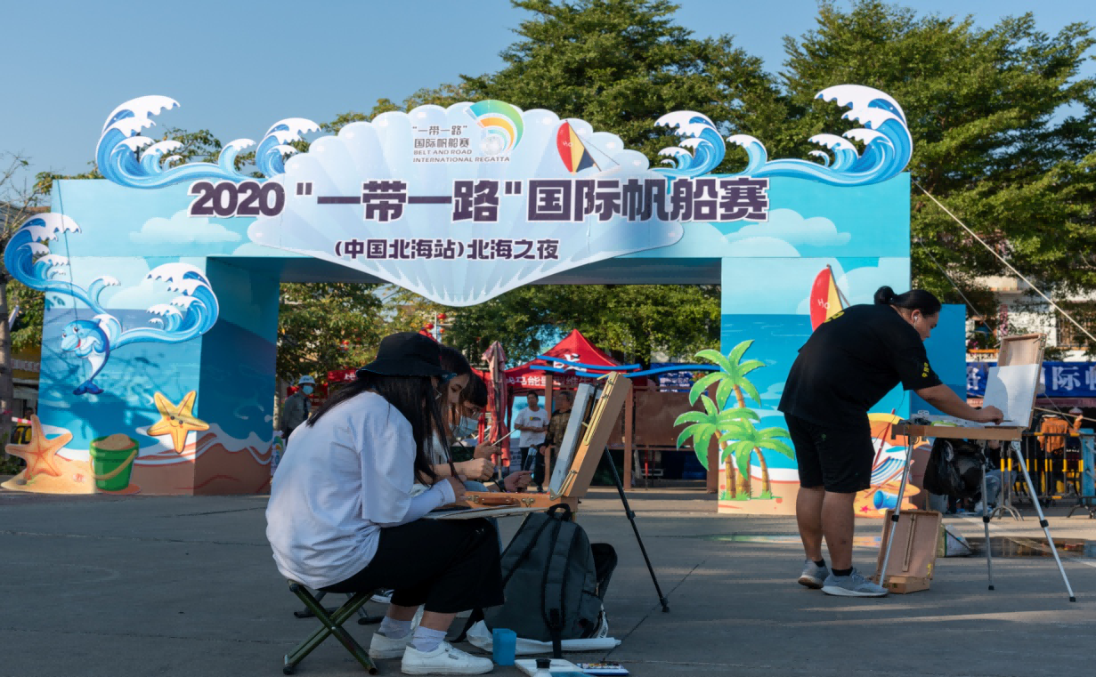 2020.11.12“一带一路”国际帆船赛(中国北海站)迎来第二季赛事,北海艺术设计学院美术学院三十多名学生在侨港码头现场作画,助力“一带一路”国际帆船赛。