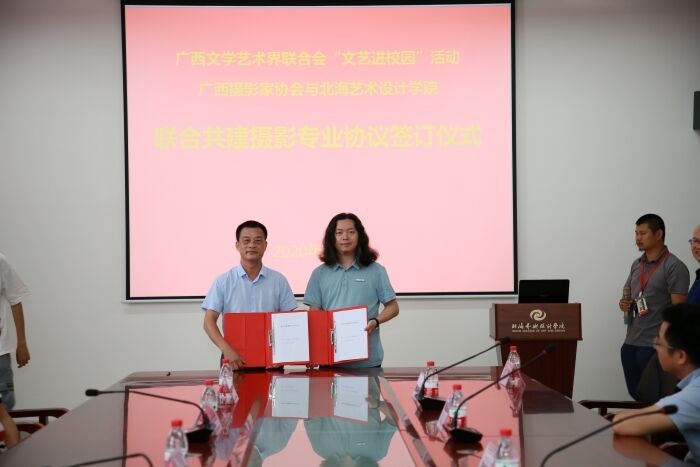 7月3日下午,广西文学艺术界联合会到我校开展“文艺进校园”活动,广西摄影家协会与我校签署了联合共建摄影专业协议,签约仪式在西校区图书馆五楼会议室举行。莅临本次活动的嘉宾有广西摄影家协会主席、秘书长施兴良,广西摄影家协会副主席邓超斌、蓝建强,广西摄影家协会理事、北海市摄影家协会主席谭瑞军,广西君人庆科技有限公司总经理、广西摄影家协会会员覃媚。我校党委书记李高南、副校长胡胜以及美术学院领导出席了本次签约仪式,并与来访嘉宾开展深入、富有成效的合作交流。