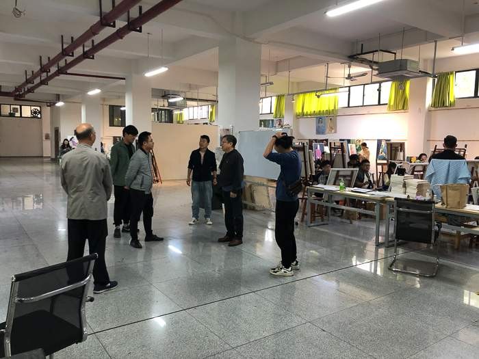 之后,美术学院常务副院长龚为、学工办主任袁志伟及美术学院绘画专业教师陪同计宇教授参观了绘画18级教学区,并进行教学指导。