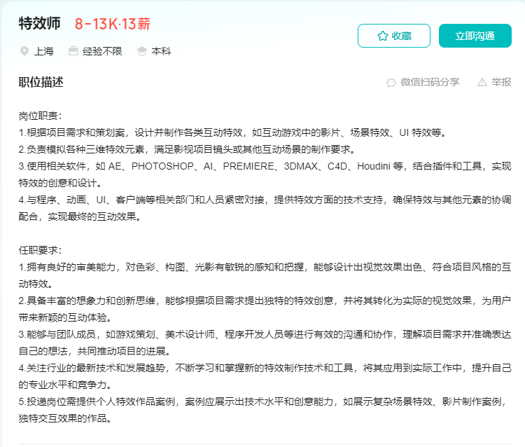 岗位职责: 1.根据项目需求和策划案,设计并制作各类互动特效,如互动游戏中的影片、场景特效、UI 特效等。 2.负责模拟各种三维特效元素,满足影视项目镜头或其他互动场景的制作要求。 3.使用相关软件,如 AE、PHOTOSHOP、AI、PREMIERE、3DMAX、C4D、Houdini 等,结合插件和工具,实现特效的创意和设计。 4.与程序、动画、UI、客户端等相关部门和人员紧密对接,提供特效方面的技术支持,确保特效与其他元素的协调配合,实现最终的互动效果。 任职要求: 1.拥有良好的审美能力,对色彩、构图、光影有敏锐的感知和把握,能够设计出视觉效果出色、符合项目风格的互动特效。 2.具备丰富的想象力和创新思维,能够根据项目需求提出独特的特效创意,并将其转化为实际的视觉效果,为用户带来新颖的互动体验。 3.能够与团队成员,如游戏策划、美术设计师、程序开发人员等进行有效的沟通和协作,理解项目需求并准确表达自己的想法,共同推动项目的进展。 4.关注行业的最新技术和发展趋势,不断学习和掌握新的特效制作技术和工具,将其应用到实际工作中,提升自己的专业水平和竞争力。 5.投递岗位需提供个人特效作品案例,案例应展示出技术水平和创意能力,如展示复杂场景特效、影片制作案例,独特交互效果的作品。