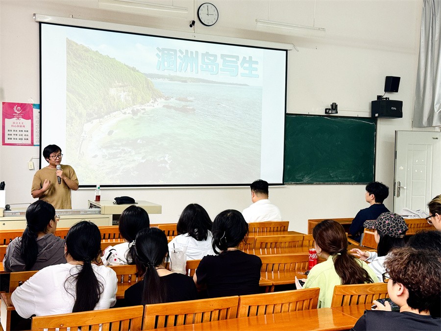 大会上,《写生》课程主讲教师江百汇详细讲解了读涠洲岛写生的各项教学任务指标、风景写生的技法要点与实施路径。结合专业人才培养需求,江百汇老师还为同学们开展摄影基础知识点培训,鼓励全体学生在写生实践期间同步创作摄影作品,积极参与我校第六届涠洲岛“鲸鱼杯”手机摄影大赛,以多元创作提升专业综合素养。