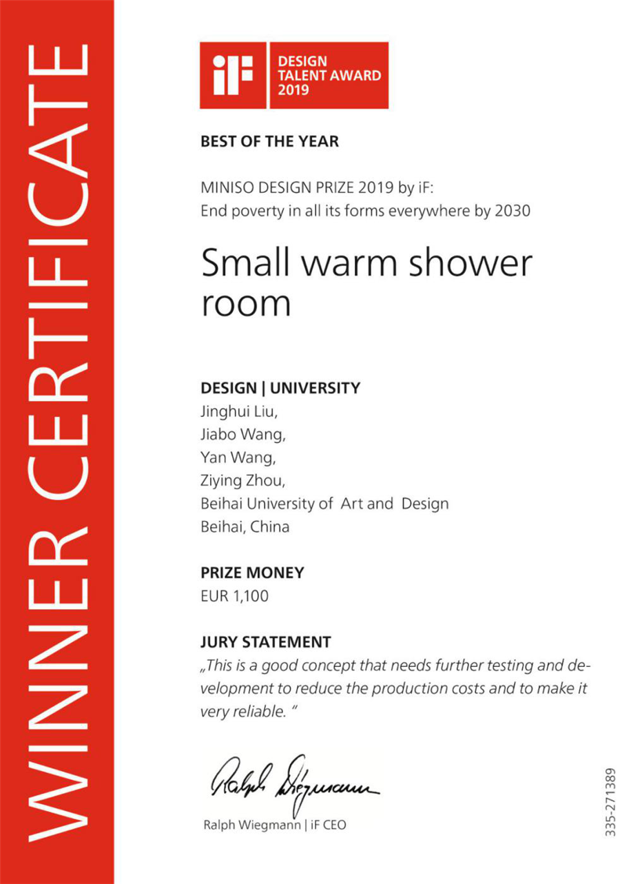 在2019年度德国iF新秀奖第二学期评选中,来自全球38个国家的参赛作品经过国际专家评审会议深入讨论与投票后,选出最优秀的52项设计 ,其中由北海艺术设计学院产品设计系5点创新设计工作室伍阳、续磊老师所指导的刘静辉、周紫莹、王艳、王嘉博同学设计的作品“Small warm shower room”(小温暖太阳能淋浴房)斩获国际大奖“iF新秀奖”(IF TALENT AWARD),并属于17项最顶尖最具创意设计之一,获得了奖金分享。这也是北海艺术设计学院产品设计专业学子首次获得该奖项。