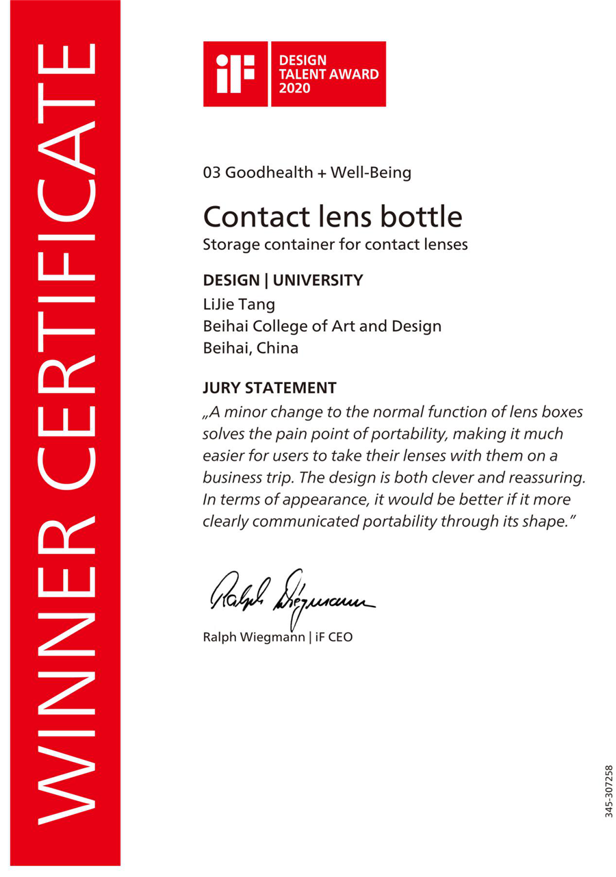 近日, 2020年度第二期德国IF设计新秀奖评选结果揭晓,由我校产品设计系赵宇晨老师指导,2017级产品设计专业唐丽婕同学所设计的作品“隐形眼镜护理液瓶(CONTACT LENS BLTTLE)”斩获2020IF设计新秀奖。
