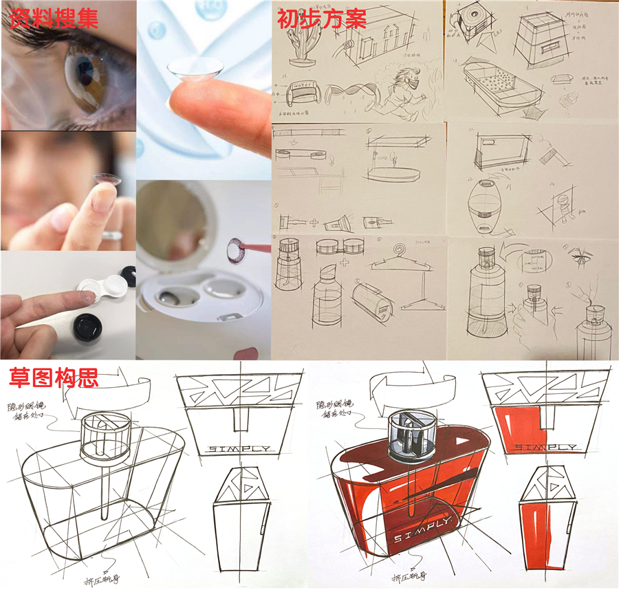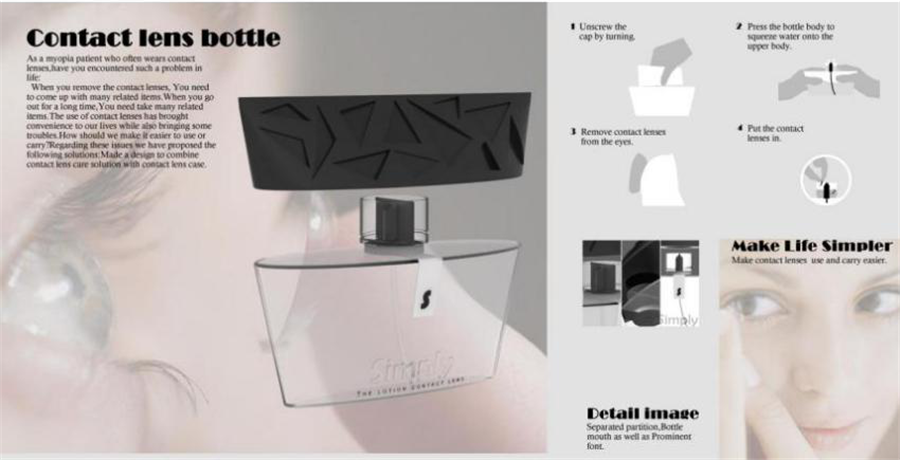 本次唐丽婕同学所设计 “隐形眼镜护理液瓶(CONTACT LENS BLTTLE)”,将用户佩戴隐形眼镜过程中使用到的护理液瓶和隐形眼镜存放盒相结合,加以导管和隔板,使得用户可以通过挤压下瓶身将护理液挤出至瓶身上端的隐形眼镜存放器中,存放完毕后还可直接将使用过的护理液倒掉,在缩小产品体积、保障卫生的同时,将复杂的佩戴过程简化为拧、挤、取、放四步。